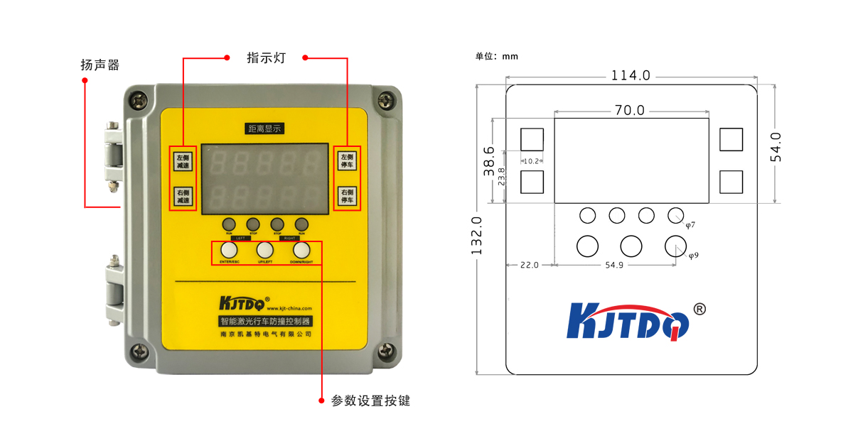 控制器功能主要是開(kāi)機(jī)自檢功能,將激光傳感器接收到的信號(hào)進(jìn)行處理和計(jì)算,根據(jù)檢測(cè)到的距離,作出相應(yīng)的機(jī)電動(dòng)作(語(yǔ)音報(bào)警和PLC控制)。可在0.5-35m的量程任意設(shè)定兩個(gè)距離作為減速和停車,安裝在司機(jī)室或電氣室梁內(nèi):控制器的功能主要是將激光傳感器接收到的信號(hào)進(jìn)行處理,根據(jù)檢測(cè)到的距離,作出相應(yīng)的繼電器報(bào)警和減速,停車動(dòng)作,具有報(bào)警及語(yǔ)音提示等功能。